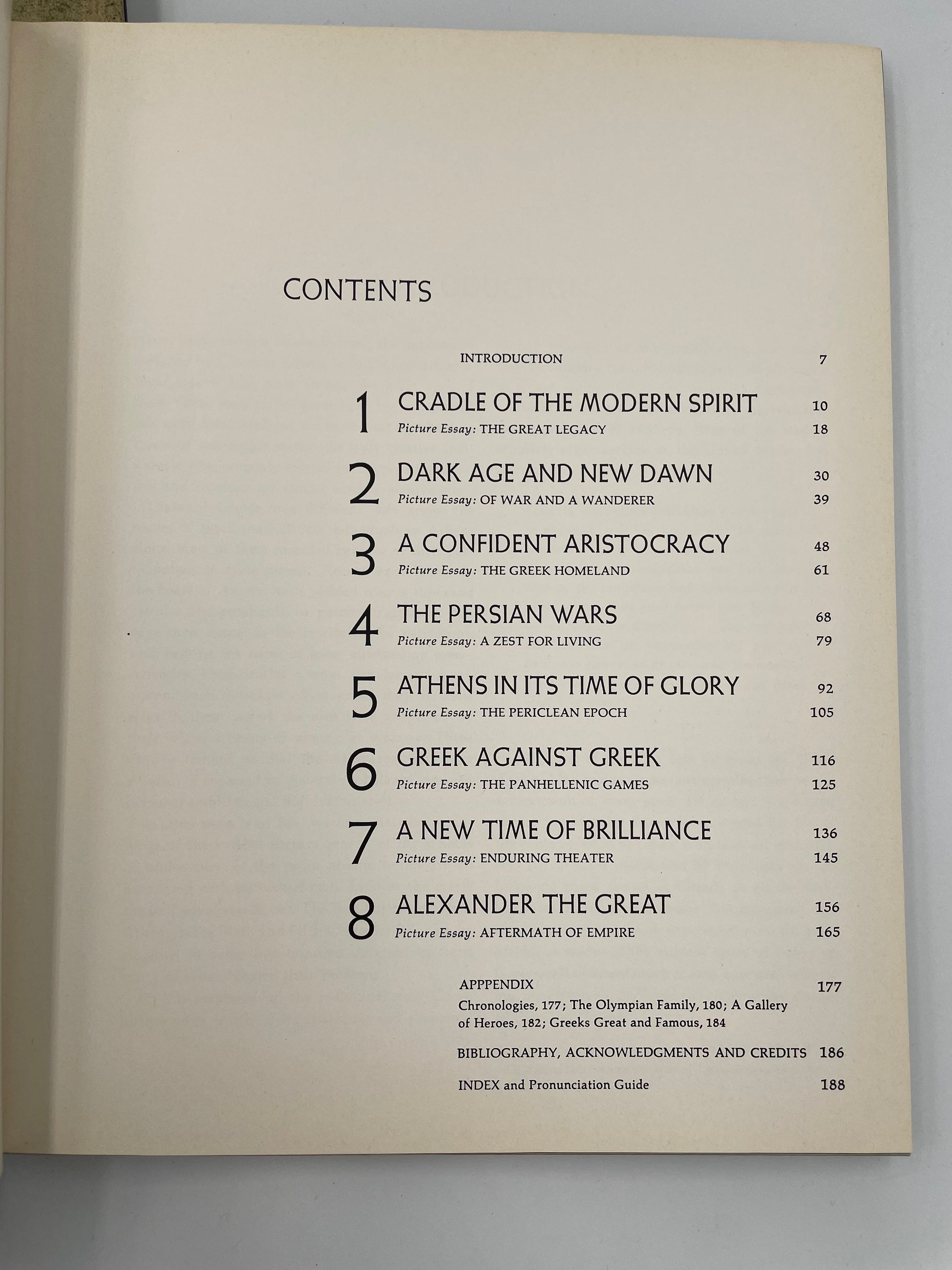 The authors offer an exploration of pivotal eras in world history. Each volume combines a popular history style narrative with period illustrations and photography characteristic of the 60s. Please see images 3,7,12, and 17, to view the contents’ pages.